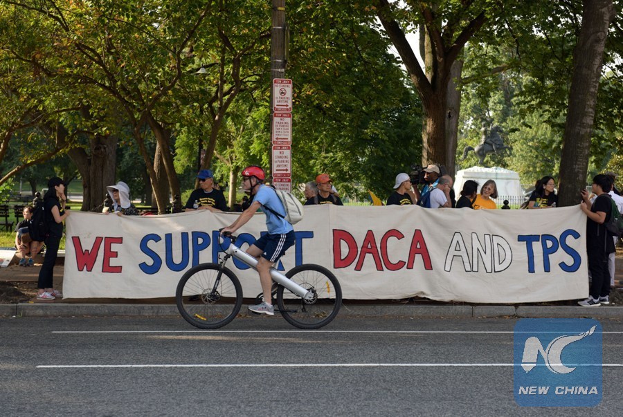 People attend a rally protesting against U.S. President Donald Trump's decision to end the Deferred Action for Childhood Arrivals (DACA) program in front of the White House in Washington D.C., the United States, on Sept. 5, 2017.(Xinhua/Yin Bogu)