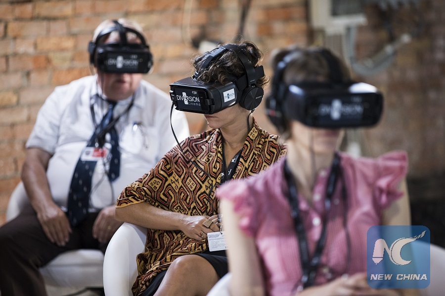 Visitors watch VR screenings during the Venice Film Festival in Venice, Italy, Sept. 5, 2017. (Xinhua/Jin Yu)