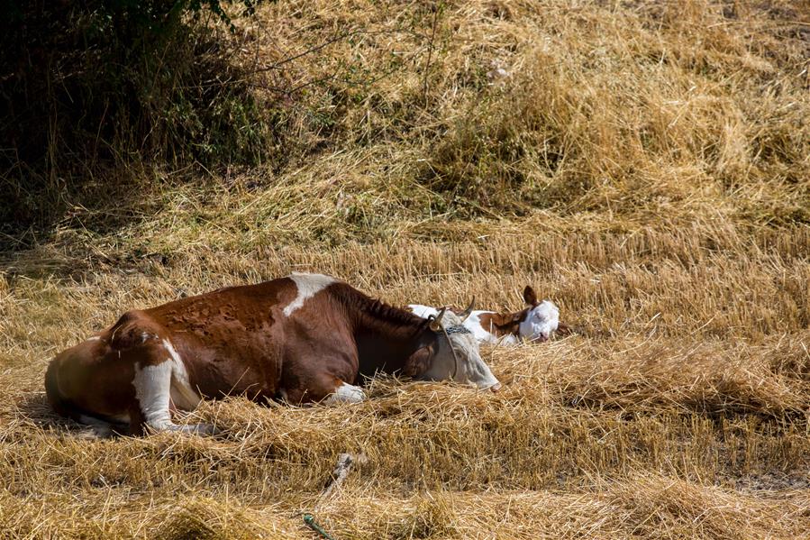 An ox and a cub rest amongst hays in Janbulak scenic spot in Qitai County of Changji, northwest China's Xinjiang Uygur Autonomous Region, Sept. 10, 2017. The scenic spot attracted visitors with its golden autumn sceneries. (Xinhua/Li Jing)