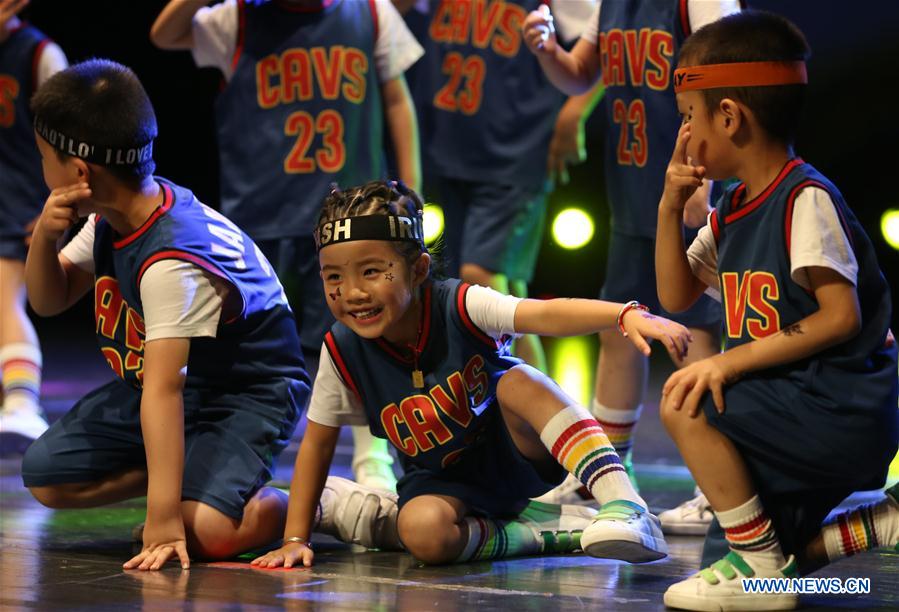 Children perform hip-hop at a theater in Nantong, east China's Jiangsu Province, Aug. 26, 2017. Some 200 children took part in the hip-hop performance here on Saturday. (Xinhua/Zhu Haochen)