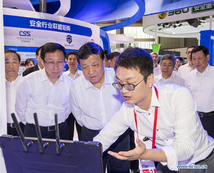 Liu Yunshan, a member of the Standing Committee of the Political Bureau of the Communist Party of China (CPC) Central Committee, also deputy head of the central Internet security and informatization leading group, visits a cybersecurity expo in east China's Shanghai, Sept. 16, 2017. Liu addressed an opening ceremony of a publicity week on Internet security in Shanghai on Saturday. (Xinhua/Li Xueren)