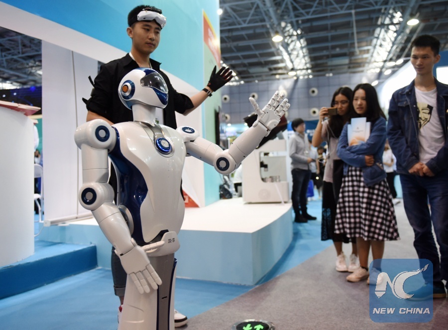 People look at a bionic robot at an exhibition during the 2017 national mass innovation and entrepreneurship week in Beijing, capital of China, Sept. 15, 2017. More than 300 items and projects on artificial intelligence, biotechnology, new material, energy conservation, environmental protection, intelligent robot and Internet plus were displayed at the exhibition. (Xinhua/Zhang Chenlin)