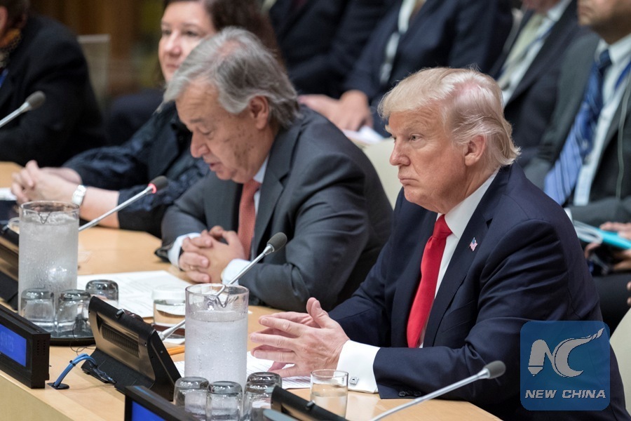 United Nations Secretary-General Antonio Guterres (2nd R) and U.S.President Donald Trump (1st R) are pictured during a high-level UN reform meeting at the UN headquarters in New York, Sept. 18, 2017. UN Secretary-General Antonio Guterres and U.S. President Donald Trump on Monday called for a change of bureaucracy in the United Nations. (Xinhua/Li Muzi)