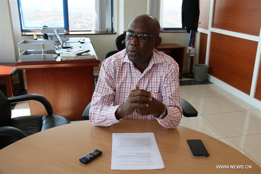 Gerald Mbanda, Head of Media Affairs and Communication Department at the Rwanda Governance Board, speaks to Xinhua in an exclusive interview about Rwanda's image in local and foreign press in Kigali, capital city of Rwanda, on Sept. 19, 2017. Mbanda on Tuesday called on local media to tell their own story about Rwanda as foreign media often portray Rwanda's image in prejudiced and negative terms. (Xinhua/Lyu Tianran)