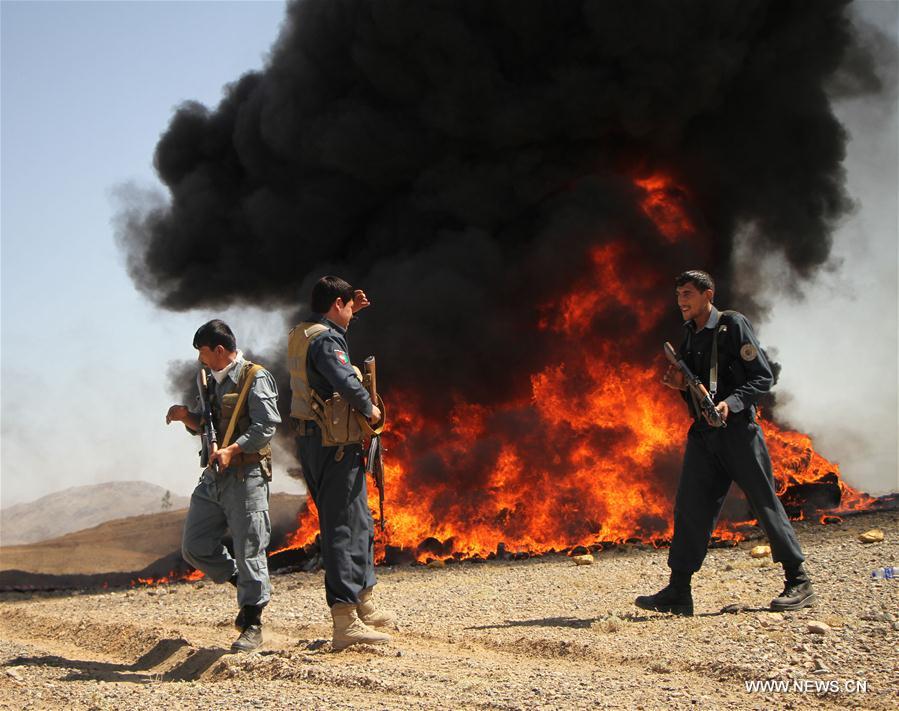 Afghan security force members stand beside burning drugs in Nangarhar province, Afghanistan, Sept. 26, 2017. A total of 13 tons of illicit drugs collected over the past two years was set on fire in Afghanistan eastern province of Nangarhar on Tuesday, provincial police chief Abdul Rahman Rahimi said. (Xinhua/Rahman Safi)