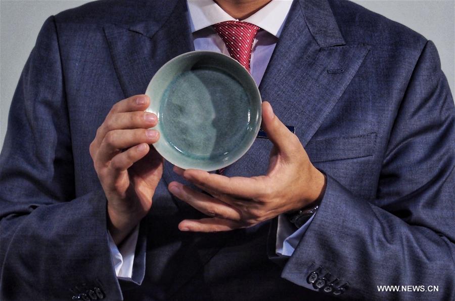 A staff member shows the rare Ru guanyao brush washer from Northern Song Dynasty (960-1127) during Sotheby's Hong Kong's autumn sale for 2017, in south China's Hong Kong, Oct. 3, 2017. A new world auction record for Chinese Ceramics was set when a rare Ru guanyao brush washer from Northern Song Dynasty sold for 294.3 million HK dollars (about 37.7 mln U.S. dollars) after a 20 minute bidding battle at Sotheby's in Hong Kong here Tuesday. (Xinhua/Wang Shen)