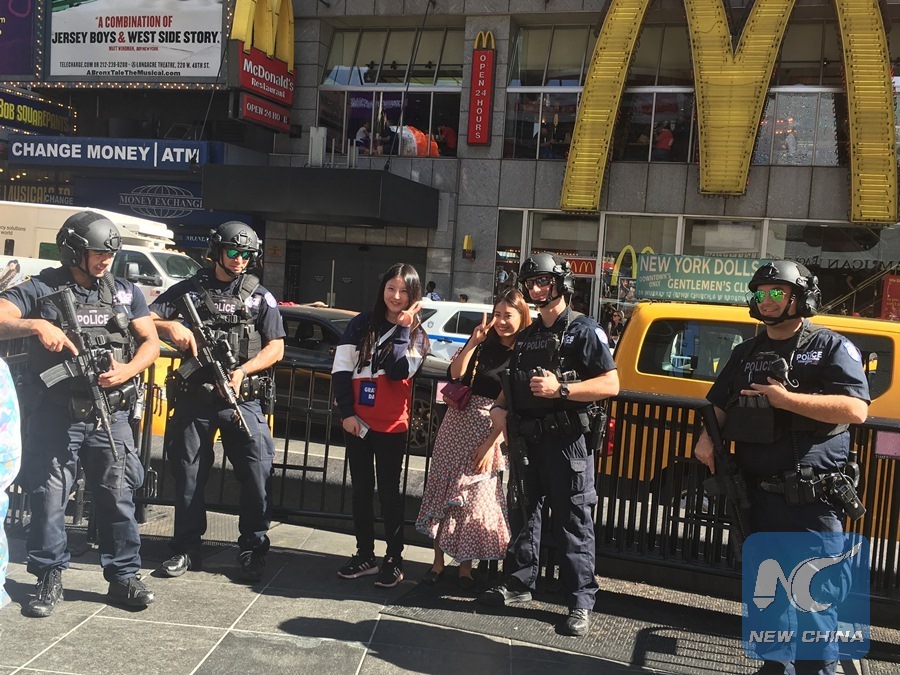 Tourists from various countries have their photos taken with uniformed officers armed with rifles in Times Square, New York. (Xinhua/Yang Shilong)