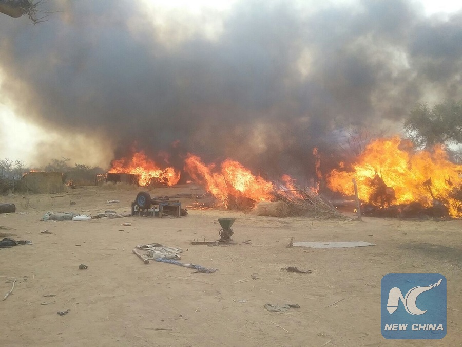 Photo taken on March 16, 2016 shows burning camps during an operation in Nigeria's northeastern state of Borno. (Xinhua/Wale Salau)