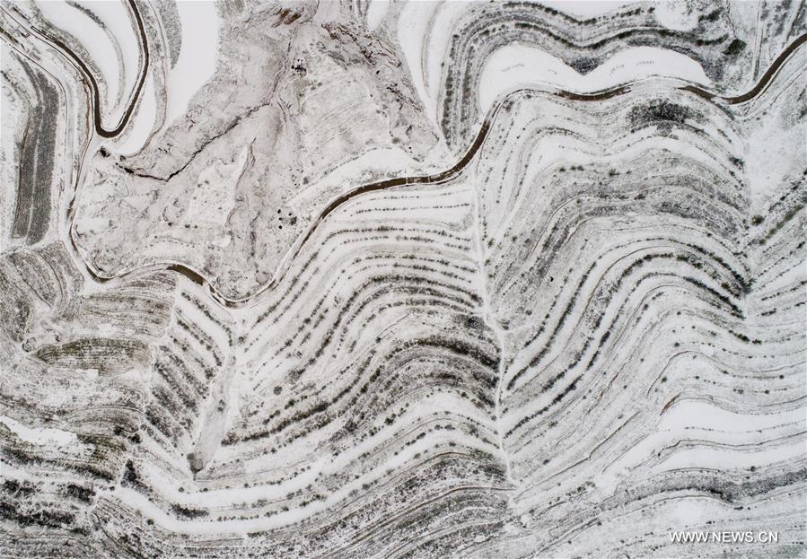 Aerial photo taken on Oct. 10, 2017 shows snow scenery in Qinglanshan Township of Dingxi City, northwest China's Gansu Province. A cold front brought snowfall to the city. (Xinhua/Chen Yonggang)