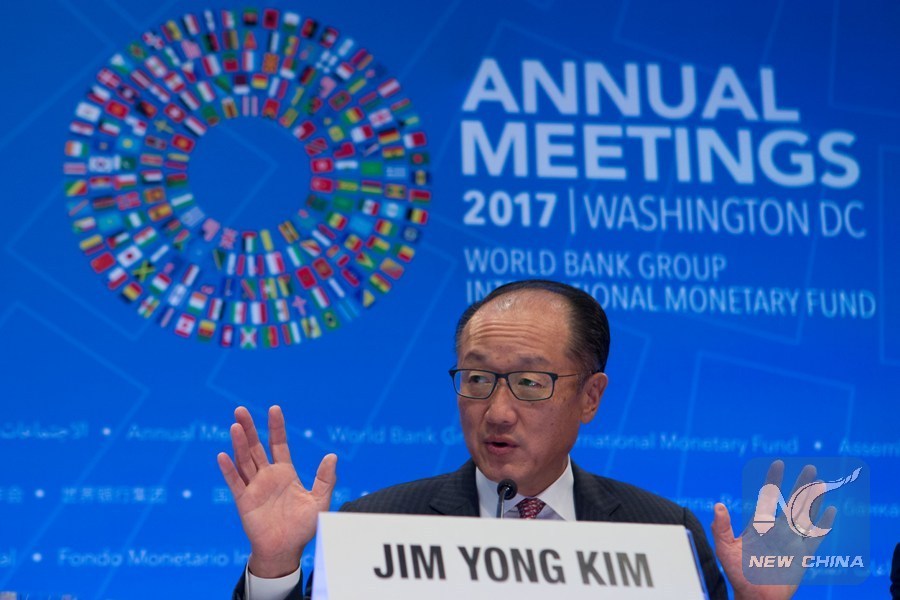 Jim Yong Kim, President of the World Bank Group, attends a press conference of the 2017 Annual Meetings of International Monetary Fund (IMF) and World Bank Group in Washington, D.C., the United States, Oct. 12, 2017. (Xinhua/Ting Shen)