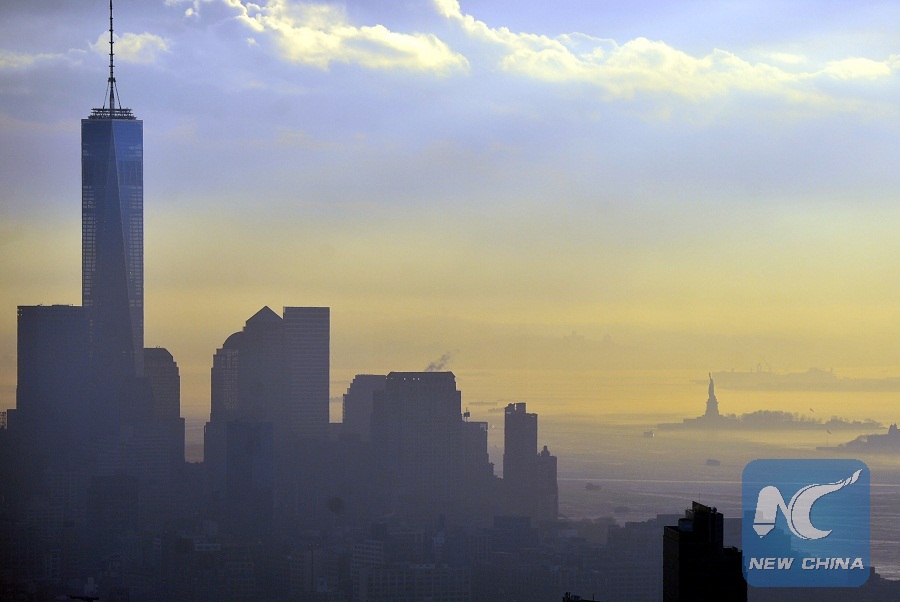 One World Trade Center and the Statue of Liberty are seen shrouded in fog in New York City, the United States, Dec. 14, 2015. (Xinhua/Wang Lei)
