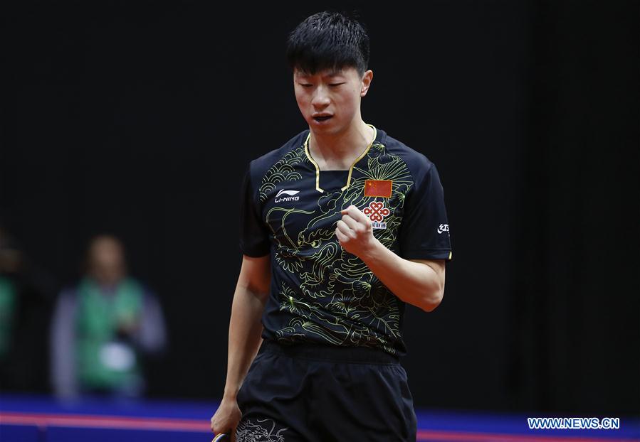 Ma Long of China celebrates during the 2017 ITTF men's singles first round match against Omar Assar of Egypt of table tennis World Cup in Liege, Belgium, Oct. 21, 2017. Ma Long won 4-1. (Xinhua/Ye Pingfan)