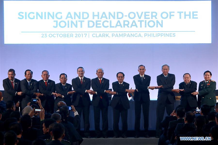 Participants join their hands during the signing and hand-over of the joint declaration on the ASEAN Defense Ministers' Meeting (ADMM) in Clark, the Philippines, Oct. 23, 2017. The defense ministers from the ASEAN nations agreed on Monday to step up counter-terrorism measures to prevent pro-Islamic State (IS) militant groups from gaining a stronghold in Southeast Asia. (Xinhua/Rouelle Umali)