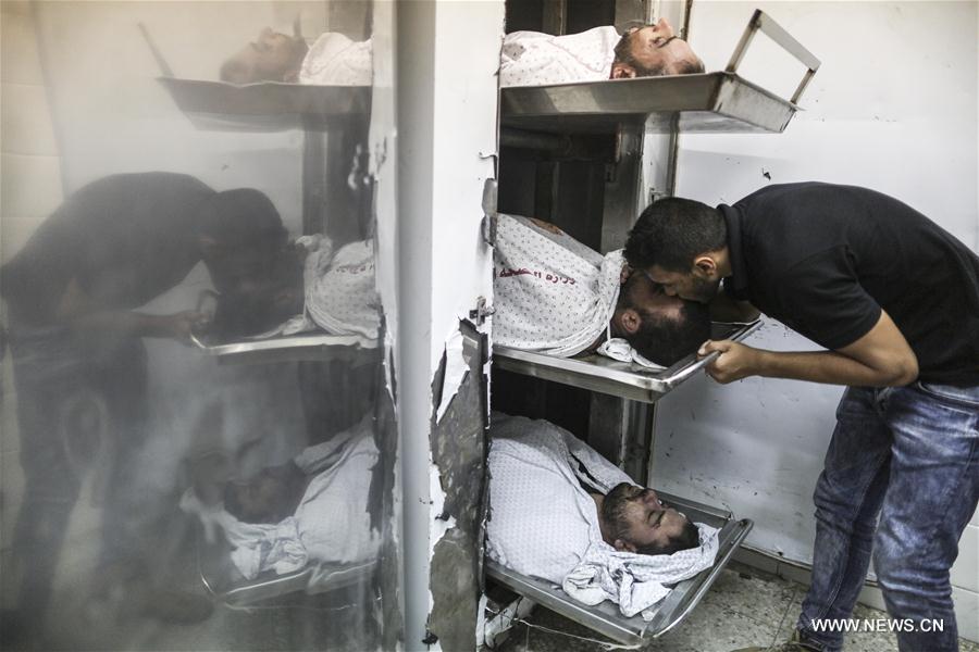 A man kisses a Palestinian killed after Israeli army bombarded a tunnel, at a morgue at al-Aqsa hospital in Deir el-Balah, central Gaza, on Oct. 30, 2017. Seven militants were killed and ten injured after the Israeli army bombarded on Monday a tunnel underneath the borders between southeast Gaza Strip and Israel, medics and security sources said. (Xinhua/Wissam Nassar)