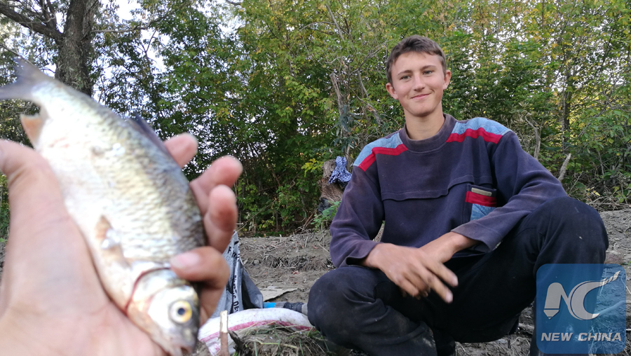 Hou meets with Andrew, a young Kazakhstani man fishing nearby, on Sept. 10, 2016. He gives Hou a crucian he catches.