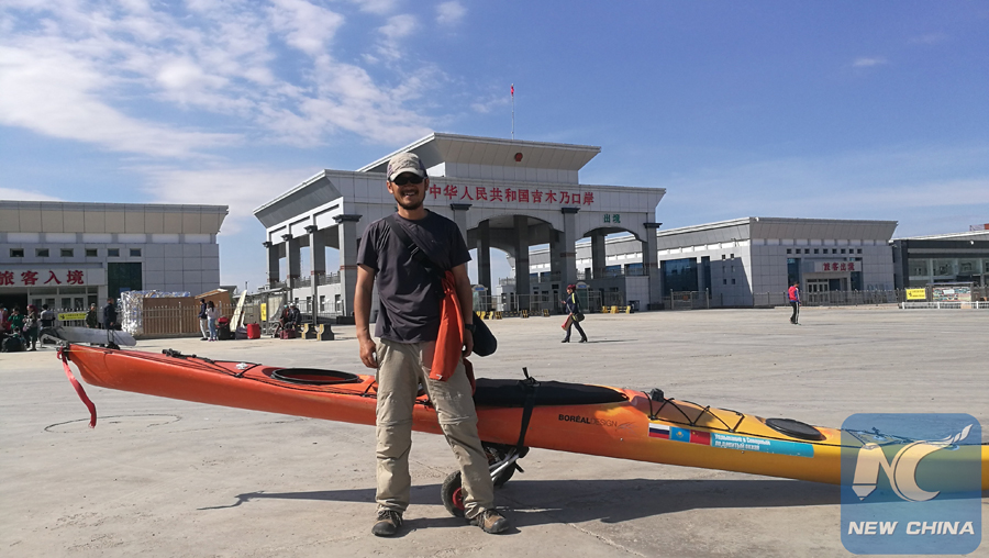 With the help of travel agencies from both sides of the border, Hou set sail from Jeminay, a Chinese county bordering Kazakhstan, in August 2016. It took him 33 days to finish rowing the 1,500-kilometer long section.