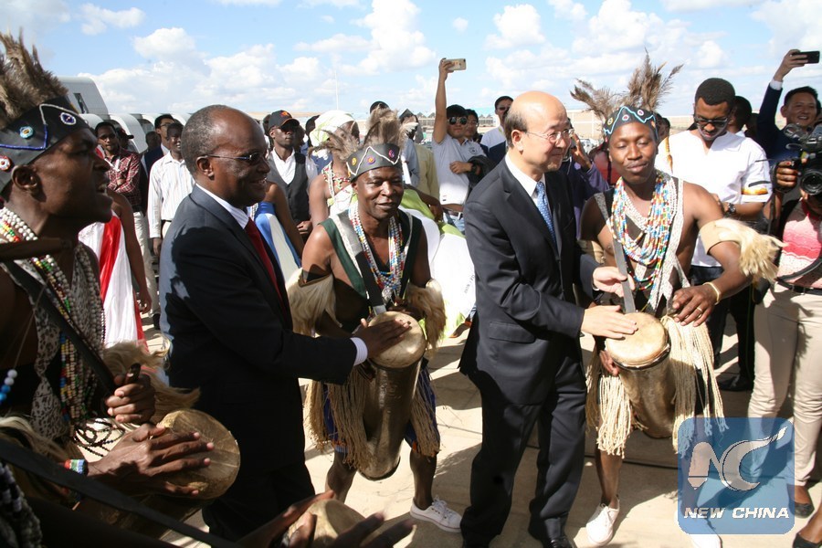 James Macharia (2nd L), Kenyan Cabinet Secretary for Transport, Infrastructure, Housing and Urban Development and Liu Xianfa (2nd R), Chinese Ambassador to Kenya join the traditional dancers during the launch and flag off of the Madaraka Express Train in Nairobi, capital of Kenya, Nov. 1, 2017. (Xinhua/Charles Onyango)