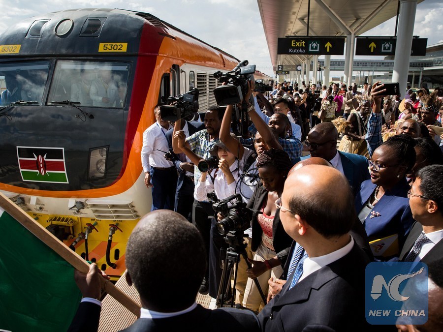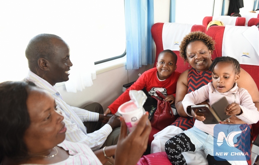 Passengers take a train from Nairobi to Mombasa along the Mombasa-Nairobi Standard Gauge Railways (SGR) in Kenya, on June 9, 2017. (Xinhua/Li Baishun)