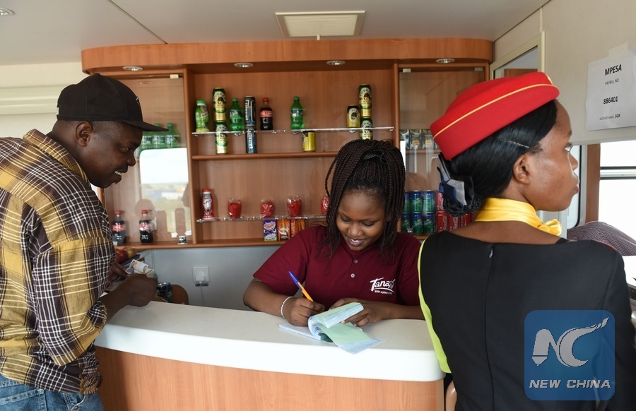 A passenger buys food at the dining car of a train from Nairobi to Mombasa along the Mombasa-Nairobi Standard Gauge Railways (SGR) in Kenya, on June 9, 2017. (Xinhua/Li Baishun)