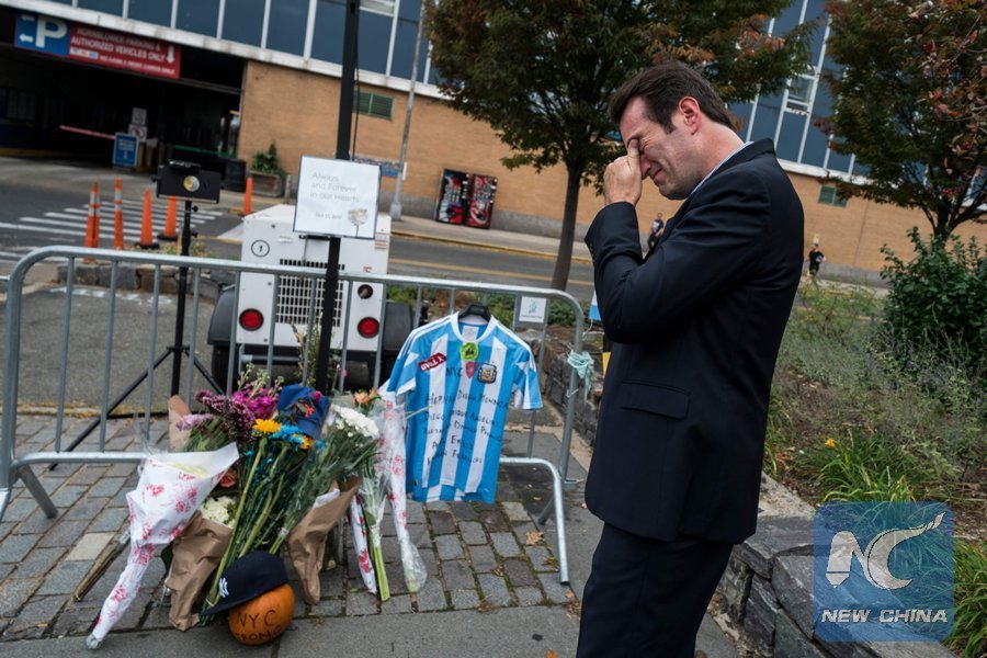 A local resident reacts after placing an Argentinian soccer jersey at a makeshift memorial for the Oct. 31 terror attack victims along a bike path in New York, on Nov. 2, 2017. (Xinhua/AFP)