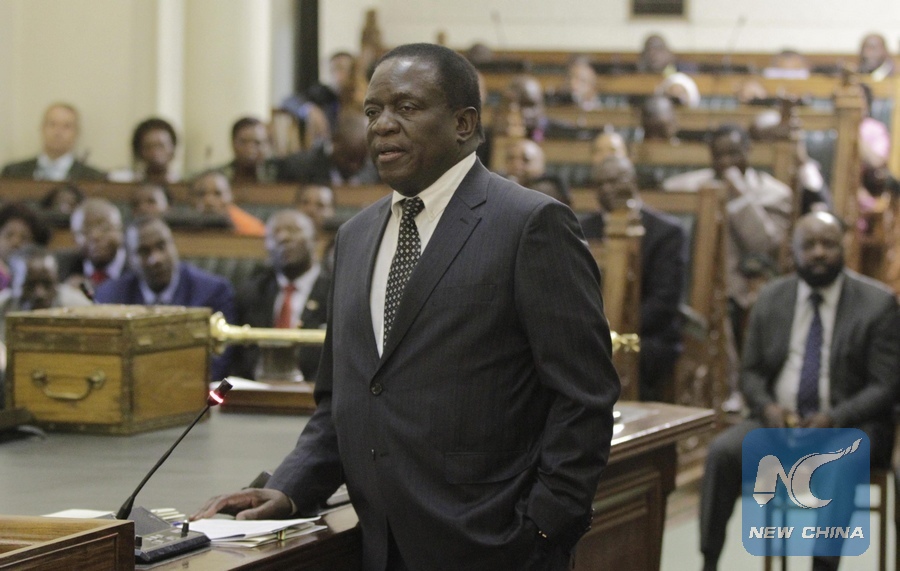 File photo shows Zimbabwean Vice President Emmerson Mnangagwa delivers a speech for the opening of the third session of the Parliament of Zimbabwe at parliament building in Harare, Zimbabwe, Sept. 16, 2015. (Xinhua/Stringer)