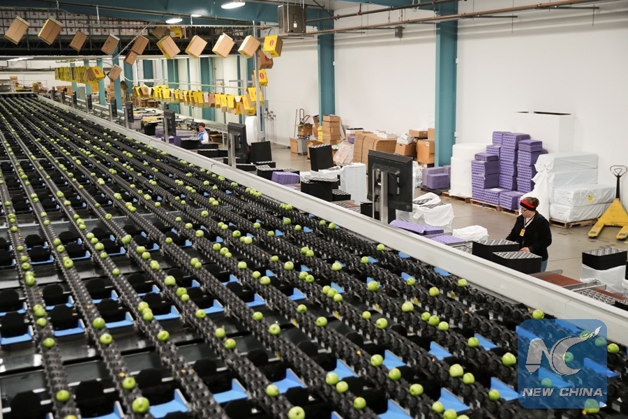 Granny Smith apples are processed on the packing line at the packing house of Auvil Fruit Company in Wenatchee of Washington State, the United States, Nov. 3, 2017. (Xinhua/ Wang Ying)