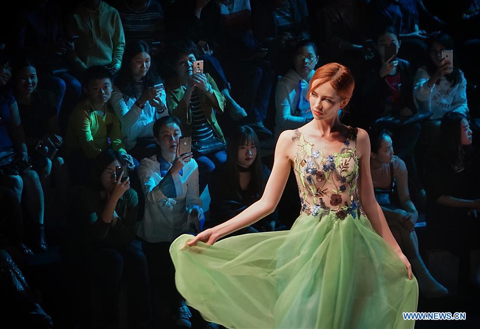 A model presents a creation during the 2017 China (Chaozhou) International Wedding & Evening Dress Week in Chaozhou, south China's Guangdong Province, Nov. 10, 2017. (Xinhua/Li An)