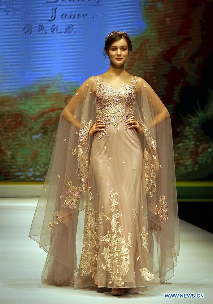 A model presents a creation during the 2017 China (Chaozhou) International Wedding & Evening Dress Week in Chaozhou, south China's Guangdong Province, Nov. 10, 2017. (Xinhua/Li An)