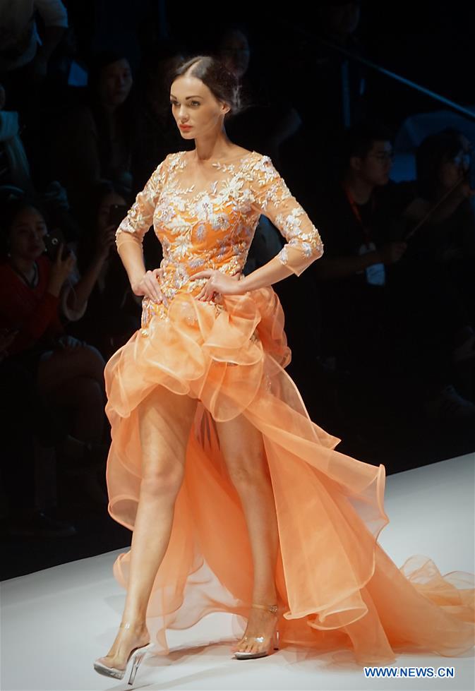 A model presents a creation during the 2017 China (Chaozhou) International Wedding & Evening Dress Week in Chaozhou, south China's Guangdong Province, Nov. 10, 2017. (Xinhua/Li An)