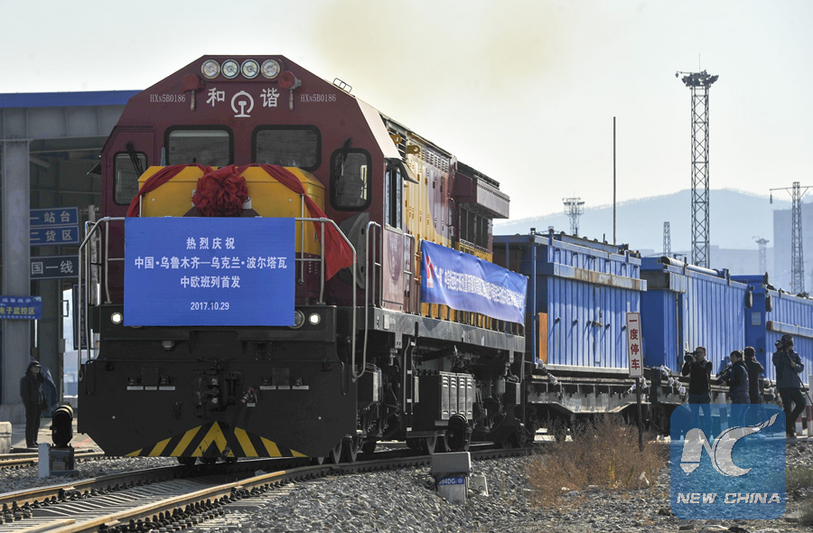 A China-Europe freight train X9081 leaves Urumqi, capital of northwest China's Xinjiang Uygur Autonomous Region, for Poltava, Ukraine, on Oct. 29, 2017. (Xinhua/Hu Huhu)