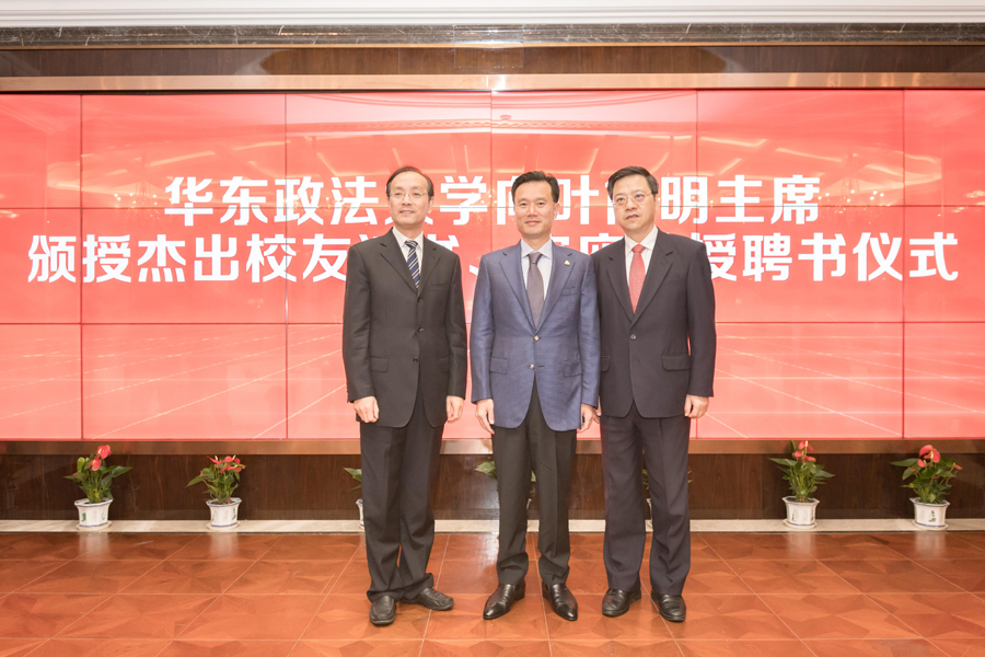 Chairman of the Board of Directors of CEFC China Ye Jianming (C) is taking a group photo with Cao Wenze (R), CPC Committee Secretary of East China University of Political Science and Law and Ye Qing (L), President of East China University of Political Science and Law in a ceremony held at the headquarters of CEFC China in Shanghai, east China, on November 16, 2017. (Photo by Ding Yi)