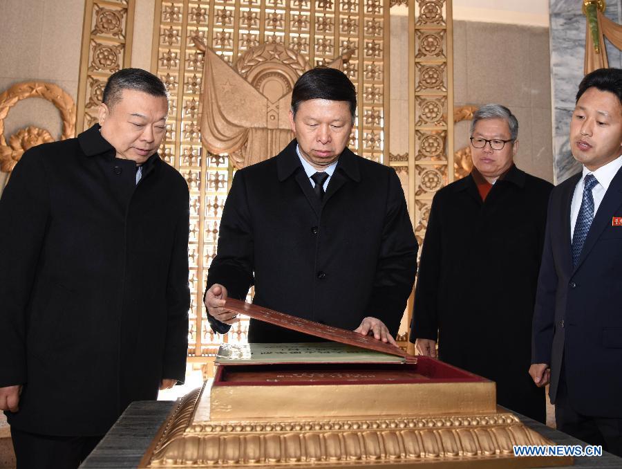 Song Tao, special envoy of General Secretary of the Communist Party of China (CPC) Central Committee Xi Jinping and head of the CPC Central Committee's International Department, visits the Friendship Tower in Pyongyang, the Democratic People's Republic of Korea, Nov. 19, 2017. (Xinhua/Cheng Dayu)