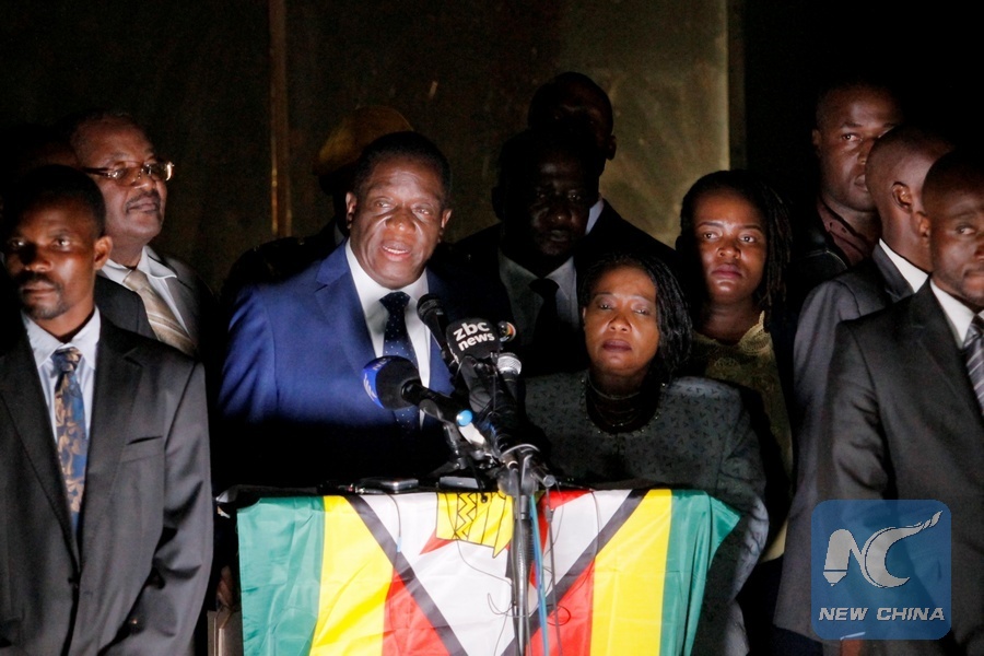 Zimbabwe's incoming president Emmerson Mnangagwa (L, center) makes a public address at ZANU-PF headquarters in Harare, capital of Zimbabwe, on Nov. 22, 2017. (Xinhua/Chen Yaqin)