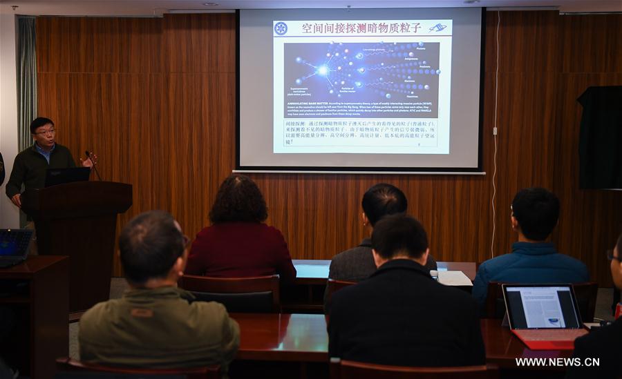 Chang Jin, chief scientist of China's Dark Matter Particle Explorer (DAMPE) and vice director of the Purple Mountain Observatory of the Chinese Academy of Sciences (CAS), speaks at a report meeting of achievement of the satellite in Nanjing, capital of east China's Jiangsu Province, Nov. 30, 2017. The satellite, also called Wukong, or Monkey King, has measured more than 3.5 billion cosmic ray particles with the highest energy up to 100 tera-electron-volts (TeV for short, corresponding to 1 trillion times the energy of visible light), including 20 million electrons and positrons, with unprecedentedly high energy resolution. (Xinhua/Li Xiang)