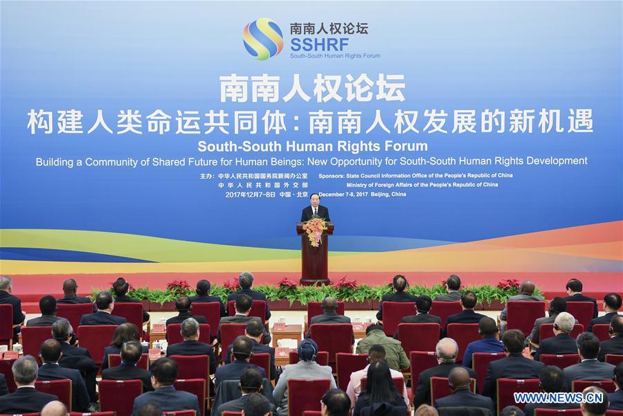 Huang Kunming, a member of the Political Bureau of the Central Committee of the Communist Party of China (CPC) and head of the Publicity Department of the CPC Central Committee, addresses the opening ceremony of the South-South Human Rights Forum in Beijing, capital of China, Dec. 7, 2017. (Xinhua/Zhang Ling)