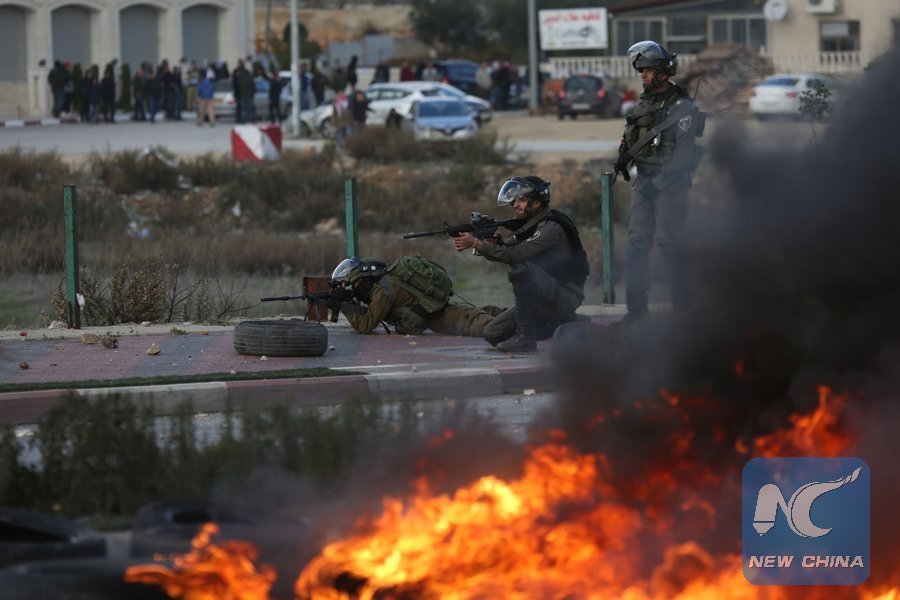 Israeli soldiers aim at Palestinian protesters during clashes after a protest against U.S. President Donald Trump's decision to recognize Jerusalem as the capital of Israel, in the West Bank city of Ramallah, Dec 7, 2017. (Xinhua/Stringer)