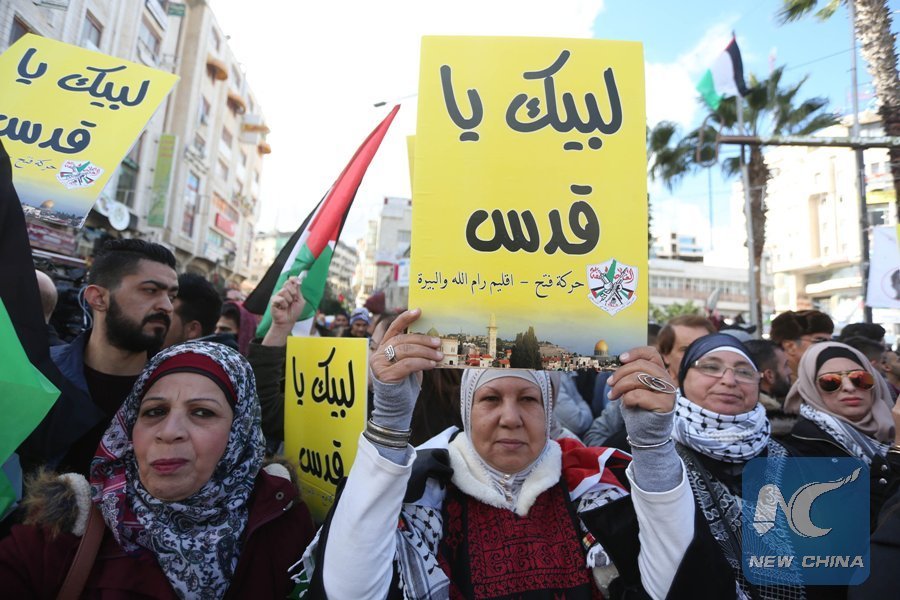 Palestinians take part in a protest against U.S. President Donald Trump's decision to recognize Jerusalem as the capital of Israel, in the West Bank city of Ramallah, Dec. 7, 2017. (Xinhua/Stringer)