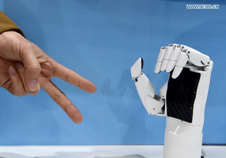 A robot plays finger-guessing game with human at 2017 International Innovation & Entrepreneurship Expo in Beijing, capital of China, Dec. 9,2017. The three-day expo kicked off at Beijing International Convention Center on Friday. (Xinhua/Luo Xiaoguang)