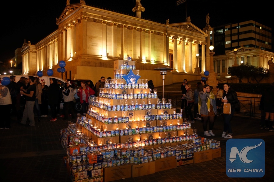 People gather around a special Christmas tree made up with milk tins and other food products in the center of Athens, Greece, on Dec. 15, 2017. The tins of milk and packages of rice, beans, sugar, olive oil and other canned food products Athenians donated throughout the day will be distributed to thousands of households in need across Greece during the holiday season. (Xinhua/Marios Lolos)