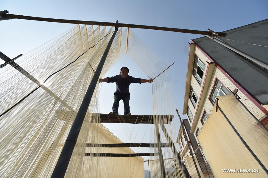 A villager dries hand-made noodles at Juehui Village of Jiexing Town in Zhongjiang County, southwest China's Sichuan Province, Dec. 19, 2017. The hand-made noodles of Zhongjiang is an intangible culture heritage of Sichuan Province. Its making procedures are so complicated that cost 16 hours to finish. (Xinhua/Wang Ping)