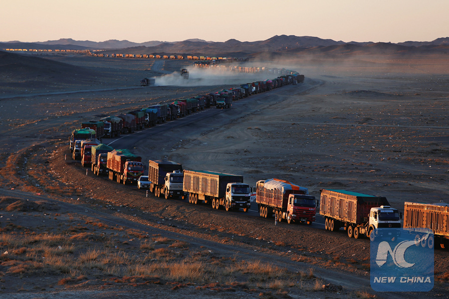 Thousands of heavy-duty trucks loaded with coal are lined up for up to 130 kilometres from the Mongolia-China border on a sole road in the Gobi desert, Mongolia, October 29, 2017. (Reuters Photo)