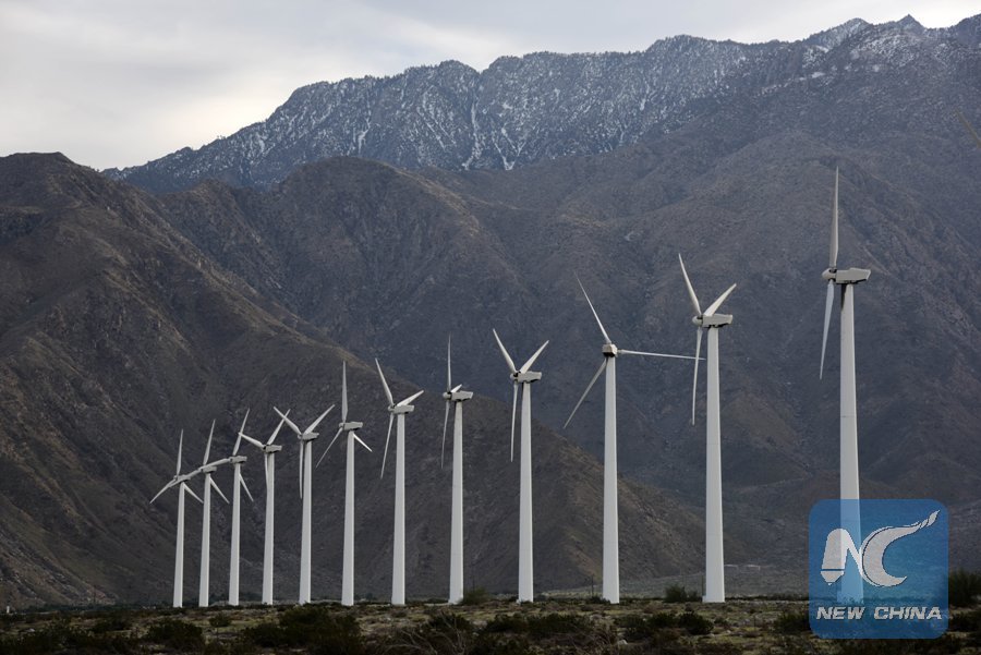 Wind turbines are seen at San Gorgonio Wind Farm near Rancho Mirage, California, the United States, Feb. 14, 2016. The wind farm contains more than 4000 separate windmills and provides enough electricity to power Palm Springs and the entire Coachella Valley. (Xinhua/Yin Bogu)