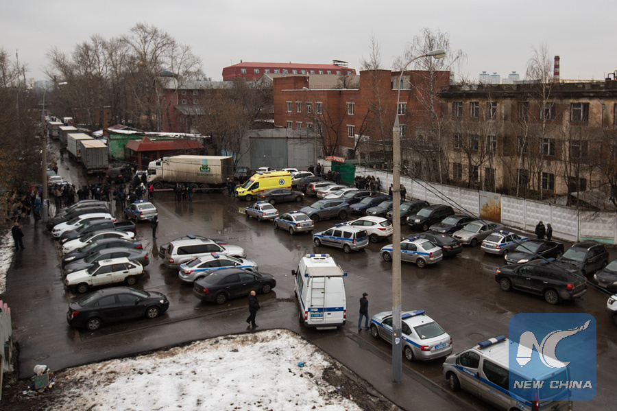 Police cars and an ambulance stop outside the building of the confectionery factory "Menshevik", where a gunman earlier opened a fire, in Moscow, Russia on December 27, 2017. (Xinhua/Wu Zhuang)