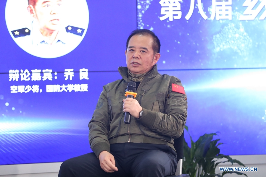 Qiao Liang, professor at the National Defense University of People’s Liberation Army, participates in a panel discussion at Xinhuanet's seminar on major global events in Beijing, capital of China, Dec. 26, 2017. (Xinhuanet/Guo Xiaotian)