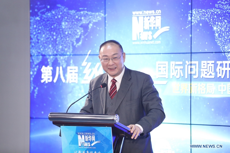 Jin Canrong, vice president of the School of International Studies at Renmin University of China, speaks at Xinhuanet's seminar on major global events in Beijing, capital of China, Dec. 26, 2017. (Xinhuanet/Guo Xiaotian)