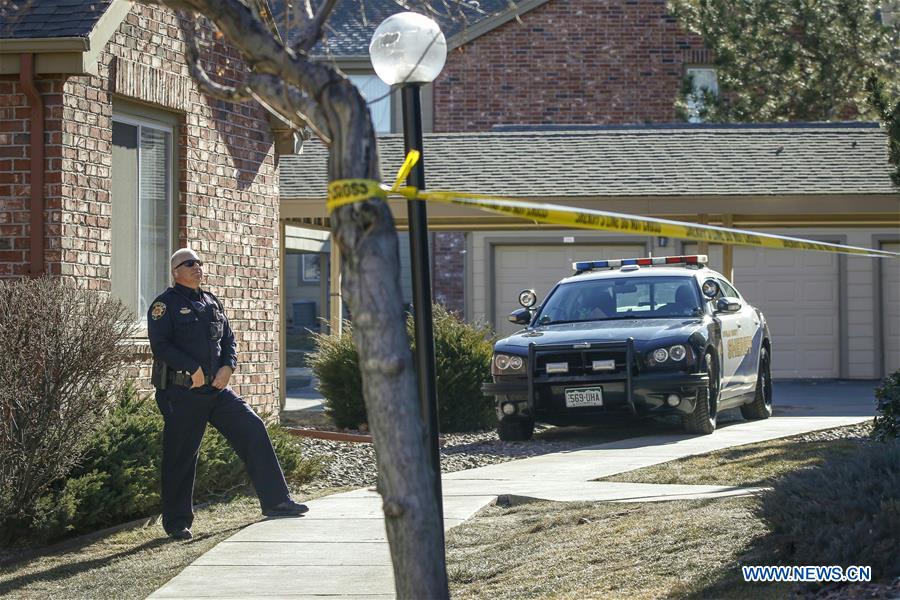 A policeman secures a suburban Denver apartment building where the shooting of several sheriff's deputies took place in Highlands Ranch, Colorado, the United States, on Jan. 2, 2018. One deputy was killed and four officers were injured after they were being called to respond to a domestic disturbance last Sunday morning at a Colorado apartment complex. (Xinhua/Marc Piscotty)