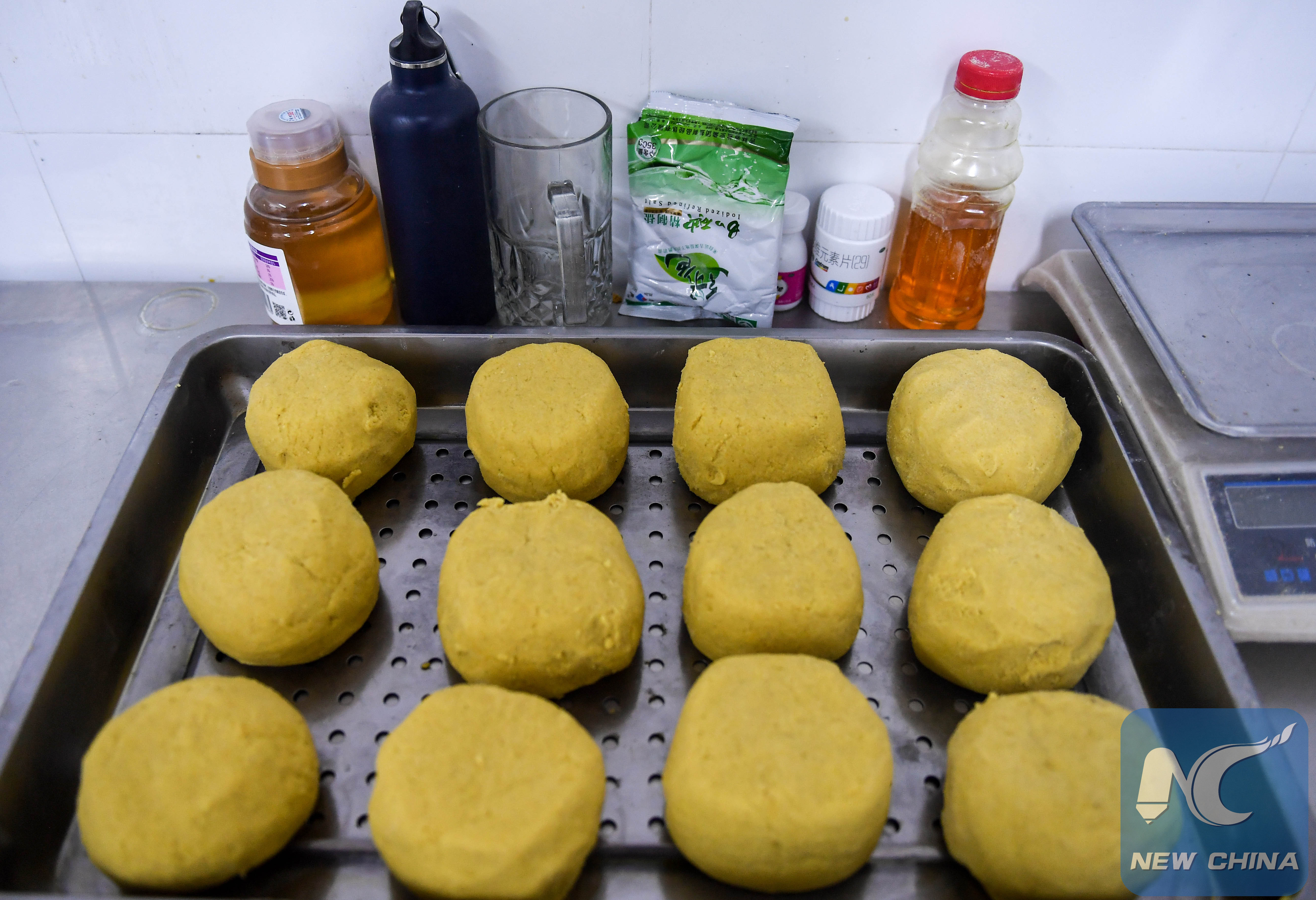 Wotou, a snack made with egg, corn, soy bean, rice, oat and vitamins, is one of the favorite food for the panda pair.(XINHUA/Shao Meiqi)