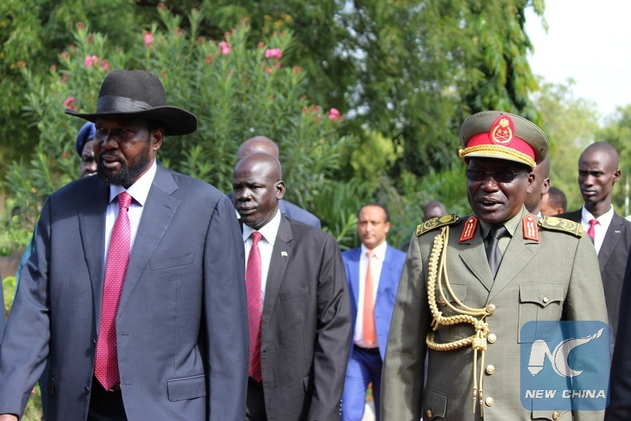 File photo shows South Sudanese President Salva Kiir (L front) and Army Chief General Paul Malong (R front) walk on a red carpet at the presidential palace in Juba, South Sudan, Oct. 28, 2016. (Xinhua/Gale Julius)