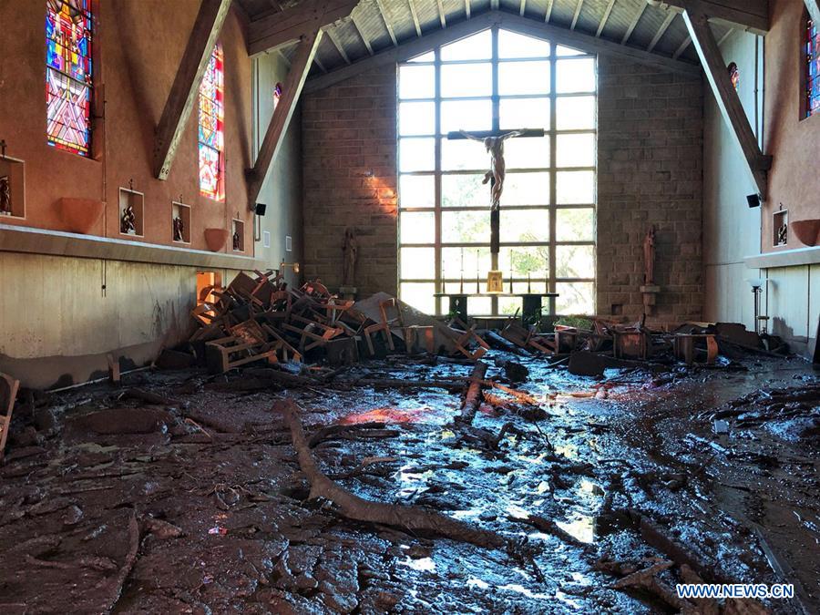 This photo provided by the Santa Barbara County Fire Department shows damage from a mudflow in a chapel in Montecito, the United States, Jan. 11, 2018. Eight people are still missing in deadly mudslides that have claimed 17 lives so far in Santa Barbara County in the western U.S. state of California, local authorities said Thursday. (Xinhua/Mike Eliason/Santa Barbara County Fire Department)
