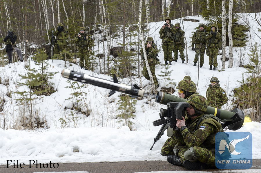 Soldiers fire FGM-148 Javelin, an American man-portable fire-and-forget anti-tank missile system during an anti-tank training in Sirgala, northeastern Estonia on March 15, 2016. (Xinhua/Sergei Stepanov)